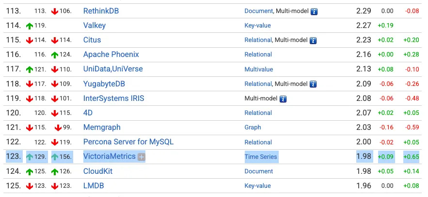 DB-Engines 网站会定期发布数据库受欢迎程度排名。在综合排名中,VictoriaMetrics 以 1.98 分位列第 123 名(共 428 名),成绩不俗。