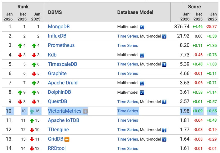 在时序数据库细分领域,VictoriaMetrics 位列第 10 名(共 45 名)。